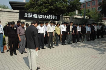 5月19日下午2:28,公司全體員工在辦公樓前集中,面向國旗和四川方向,向四川汶川大地震遇難者默哀三分鐘。在司辦公的外單位人員同時哀悼。黨委副書記、副董事長徐憲華主持哀悼儀式。