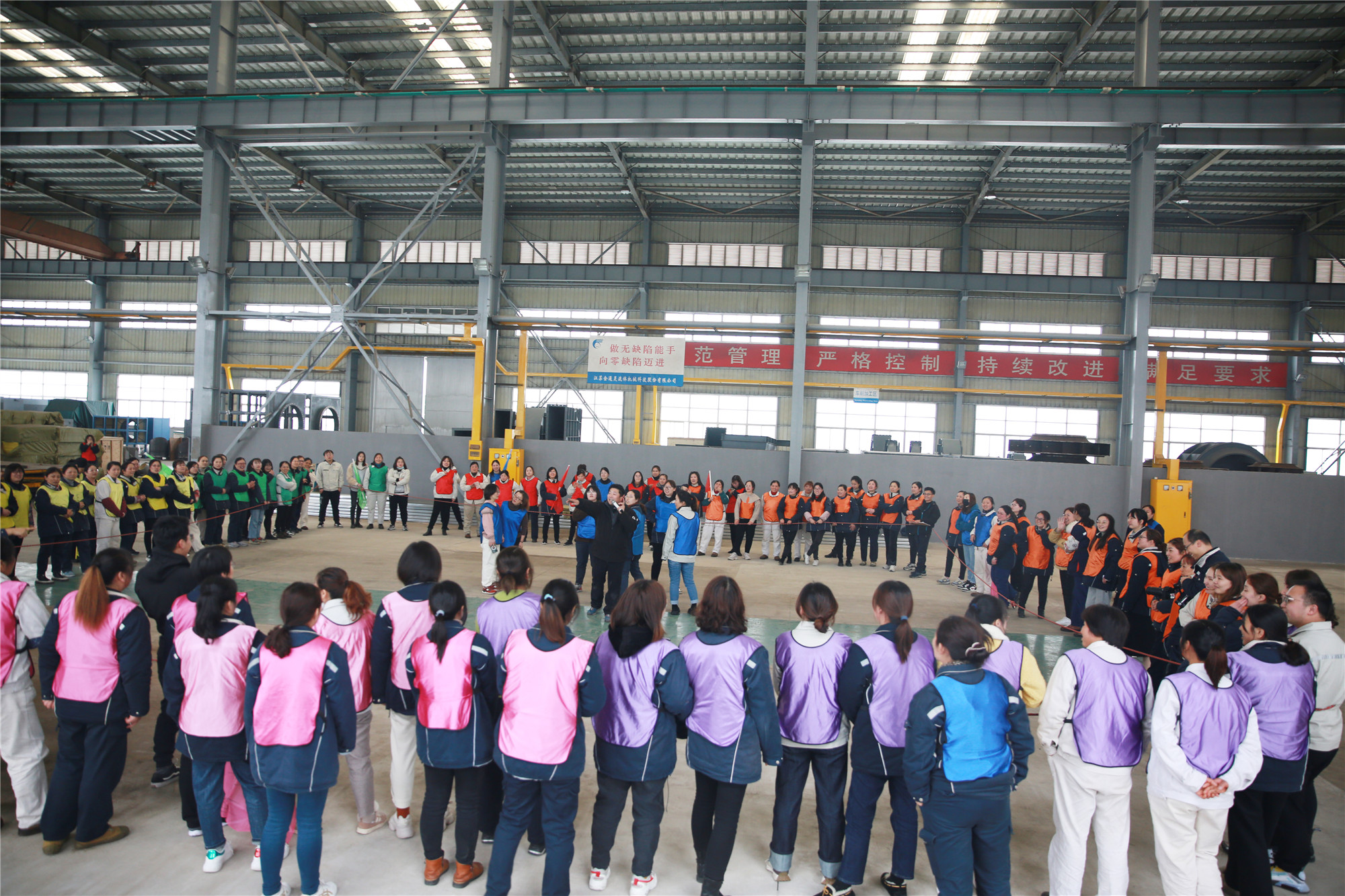 3月8日下午, 一百多名女職工歡聚2號(hào)車間,在教練的帶領(lǐng)下,分成了10個(gè)小組,按照要求分別設(shè)計(jì)了自己隊(duì)的隊(duì)名、隊(duì)徽、口號(hào)、隊(duì)歌,并依次展示了團(tuán)隊(duì)風(fēng)采。在充滿樂(lè)趣的熱身小游戲后,便開(kāi)始了“坦克大戰(zhàn)”、“環(huán)游世界球”、“動(dòng)力繩圈”等團(tuán)隊(duì)拓展項(xiàng)目。在彼此信任、相互溝通、集體協(xié)作的氛圍中,各小組成功完成了此次拓展任務(wù)。參加此次活動(dòng)的廣大女職工們有長(zhǎng)期伏案的科員,有奮戰(zhàn)一線的工人,也有集團(tuán)中高層領(lǐng)導(dǎo),在新組建的團(tuán)隊(duì)中,大家拋開(kāi)身份,融入隊(duì)伍,在隊(duì)長(zhǎng)的帶領(lǐng)下,克服困難,團(tuán)結(jié)一心,共同為隊(duì)伍加分增光。 此次拓展活動(dòng),既緩解了女職工們工作的疲憊和壓力,又增進(jìn)了同事間的友誼,增強(qiáng)了團(tuán)隊(duì)凝聚力,大家在娛樂(lè)中感受到團(tuán)隊(duì)的力量。集團(tuán)黨委副書記、工會(huì)主席李建兵給女工們送上節(jié)日的祝福,他表示,廣大女職工們?cè)诖舜位顒?dòng)中充分展示了巾幗風(fēng)采,彰顯出金通靈女工隊(duì)伍的魅力,在今后的工作中,大家要時(shí)刻握緊手中的“動(dòng)力繩”,勁往一處使,力往一處用,跟著團(tuán)隊(duì)的步調(diào),以?shī)^發(fā)昂揚(yáng)的姿態(tài)繼續(xù)前行! |